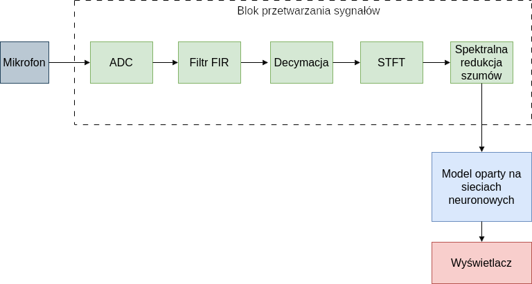 Najlepszy model został nastepnie dotrenowany na próbkach pochodzących z docelowego mikrofonu podłącoznego do mikrokontrolera, a liczba klas wyjściowych została zredukowana do 4. Przed konwersją na mikrokontroler STM32 z użyciem narzędzia X-Cube-AI sieć została dodatkowo zoptymalizowana i poddana procesowi kwantyzacji.