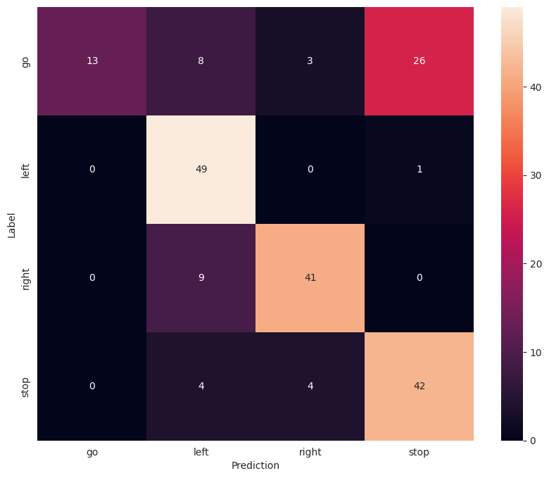 Sieć neuronowa została wytrenowana z użyciem biblioteki Tensorflow w trybie offline na zbiorze danych speech commands. Poniżej przedstawiona została macierz pomyłek dla najlepszego modelu na danych testowych.